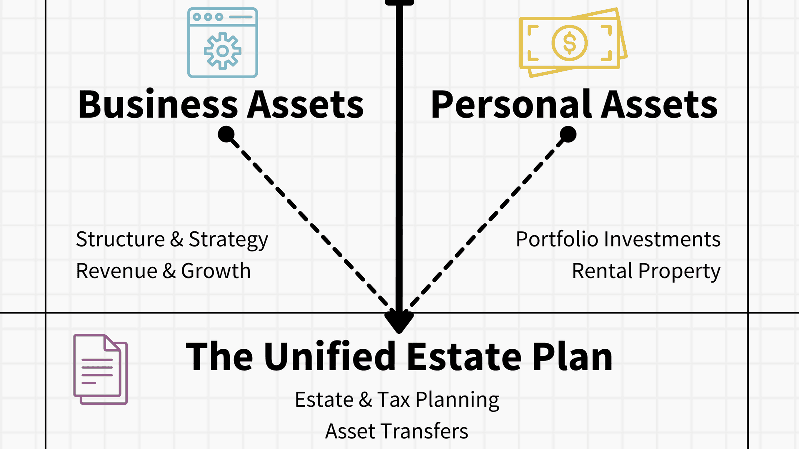 This visual framework helps you understand how each component relates to the others. Your business generates income and builds value, your investments grow wealth and provide diversification, and your estate plan ensures that both streams are protected and efficiently transferred according to your wishes. The V-shape reminds us that while you maintain separation between business and personal assets for liability protection, they ultimately unite in a cohesive estate planning strategy.